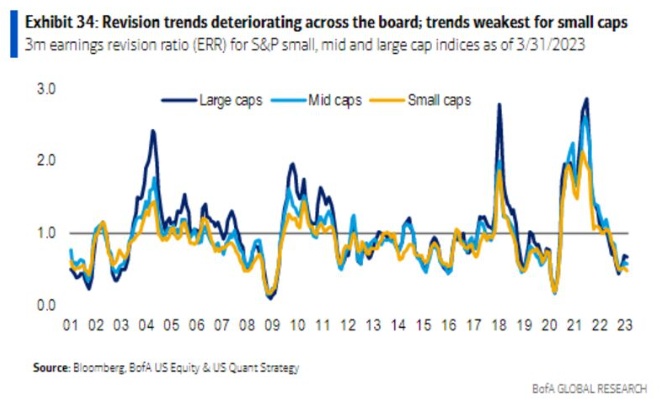 上周,Subramanian领导的团队预计,一季度财报季将是一个糟糕的财报季,等待投资者们的将是企业利润恶化和疲软指引的双重打击,而更可怕的是,2023年剩余的时间里会更糟糕。美银预计,“大幅削减”是全年盈利预测的主题。伴随着各企业公布一季度财报,在经济大环境恶化的情况下,本季度给出的未来预期也会更为疲软。