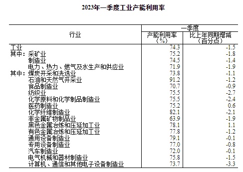 分主要行业看,一季度,煤炭开采和洗选业产能利用率为73.8%,食品制造业为70.7%,纺织业为75.5%,化学原料和化学制品制造业为75.5%,非金属矿物制品业为63.9%,黑色金属冶炼和压延加工业为78.1%,有色金属冶炼和压延加工业为77.8%,通用设备制造业为79.1%,专用设备制造业为77.0%,汽车制造业为72.0%,电气机械和器材制造业为75.8%,计算机、通信和其他电子设备制造业为73.7%。