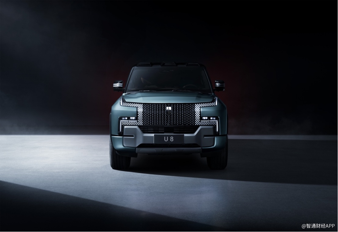 仰望U8的外观,融合了时空之门设计语言,前卫霸气,气场全开。庞大方正的车身,搭配星际穿越大灯,极具辨识度。此外,车顶探测系统、D 柱能量塔等细节设计,提升了人与车的智能交互体验。