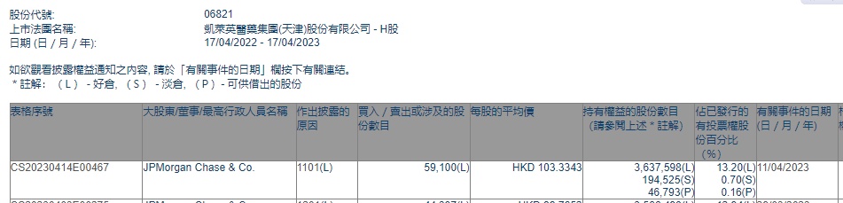 智通财经APP获悉,香港联交所最新资料显示,4月11日,小摩增持凯莱英(06821)5.91万股,每股作价103.3343港元,总金额约610.71万港元。增持后最新持股数目约为363.76万股,最新持股比例为13.20%。