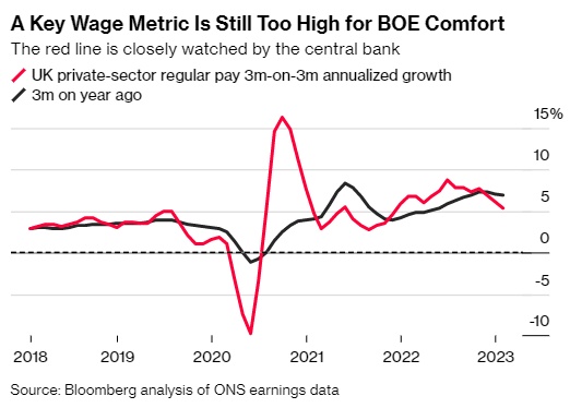 此前,以英国央行行长贝利为首的政策制定者预计,薪酬增长将降温并缓解通货膨胀(目前通胀是其2%目标的五倍),但最新数据引发了关于英国央行能否暂停30年来最快的一系列加息的争论。