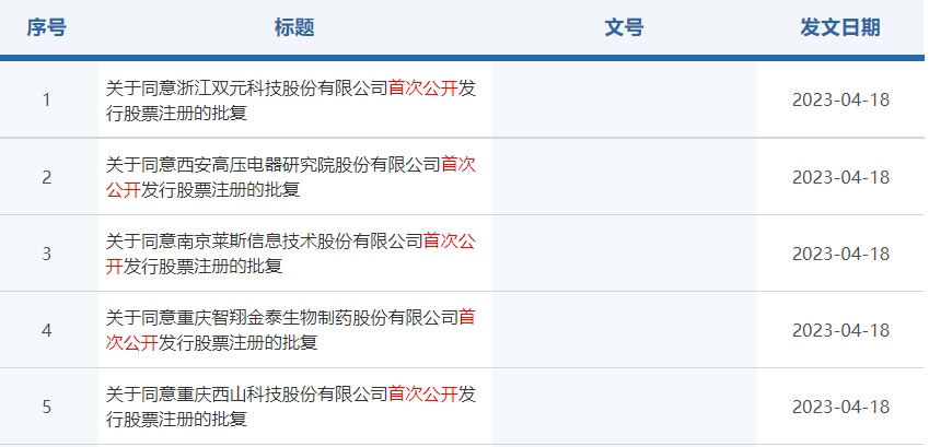 智通财经APP获悉,4月18日,证监会同意重庆西山科技股份有限公司、重庆智翔金泰生物制药股份有限公司、南京莱斯信息技术股份有限公司、西安高压电器研究院股份有限公司、浙江双元科技股份有限公司首次公开发行股票并在科创板上市的注册申请。