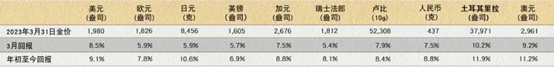 此外,3月8日,美国硅谷银行爆雷;3月15日,欧洲瑞士信贷出现流动性危机。海外银行业风险事件集中爆发,对欧美资本市场造成强烈冲击,避险情绪快速升温,CBOE波动率指数一度冲高至30.81,3月9日-13日激增38.78%,带动2022年内本就在高位的国际金价继续加速上行。美国10年期国债收益率跌了40个基点,从而提振了黄金表现,使其站稳2000美元大关。