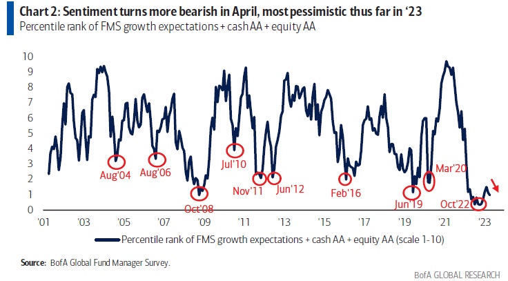 不过,美国银行策略师Michael Hartnett在报告中写道,市场情绪转向极度悲观是风险资产走向“反转趋势”的重要信号。他表示:“如果投资者普遍认为经济衰退的渴望在第二季得不到满足,那么‘痛苦交易’将是美债收益率和美股银行股大幅度上扬。”