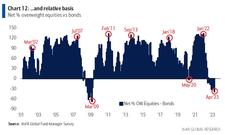 智通财经APP获悉,美国银行对全球基金经理的一份最新调查显示,投资者们对于股票的配置相对于债券的配置仓位,已降至上一次全球金融危机以来的最低水平,主要原因是投资者对信贷紧缩和全球经济衰退的担忧情绪加剧。