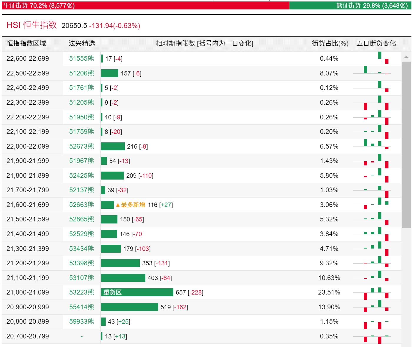 法兴恒指牛熊证街货分布图中的数据显示,熊证街货重货区在21000-21099区间,该区间最新熊证数量为657张,较上一交易日减少228张;最多新增在21600-21699区间,该区间最新熊证数量为116张,较上一交易日增加27张。