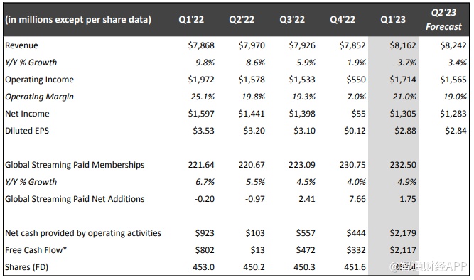 一季度,全球流媒体付费用户总数2.325亿,同比增长4.9%,低于分析师预期的2.33亿;新增付费用户175万,不及分析师预期的241万。