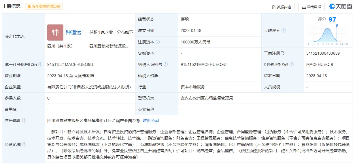 天眼查资料显示,四川五粮液新能源投资有限责任公司经营范围包括新兴能源技术研发;自有资金投资的资产管理服务;合同能源管理;成品油批发;石油制品销售;润滑油销售;燃气经营等。