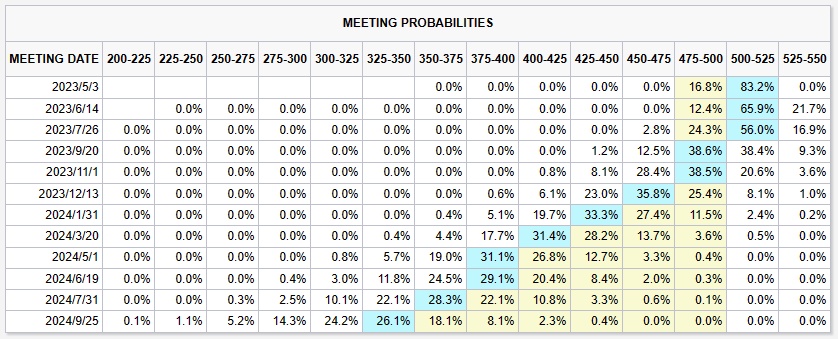 博斯蒂克的这番言论表明他不认为美联储今年内将进行降息。然而,市场并不认同美联储将持观望态度的看法。芝加哥商品交易所(CME)的“联储观察”工具显示,市场预计美联储在5月3日加息25个基点的概率为83.2%,然后将停止加息。此外,市场预计,随着经济放缓,美联储将从9月开始降息,且年内将降息50个基点。