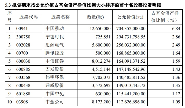 持仓方面,该基金前十大重仓股分别为中国移动(00941)、宁德时代(300750.SZ)、思源电气(002028.SZ)、腾讯控股(00700)、中信证券(600030.SH)、宏发股份(600885.SH)、伟明环保(603568.SH)、通威股份(600438.SH)、中国中免(601888.SH)、中金公司(03908)。