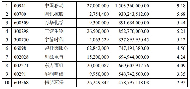 持仓方面,该基金前十大重仓股分别为中国移动、腾讯控股、万华化学、三诺生物、宁德时代、碧桂园服务(06098)、思源电气、东方雨虹、华润啤酒(00291)、伟明环保。