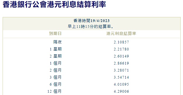 智通财经APP获悉,4月19日,港元拆息全线上涨,香港银行公会数据显示,隔夜拆息升穿2厘水平,升至2.10857厘,较上日升逾42点子,创近1个月高,连升两日;与楼按相关的1个月拆息升逾5点子,报2.86619厘,是近两星期高位;3个月拆息升逾4点子,报3.54714厘,创逾1星期高。长息方面,6个月拆息升至4.01095厘;1年期拆息升至4.29006厘。