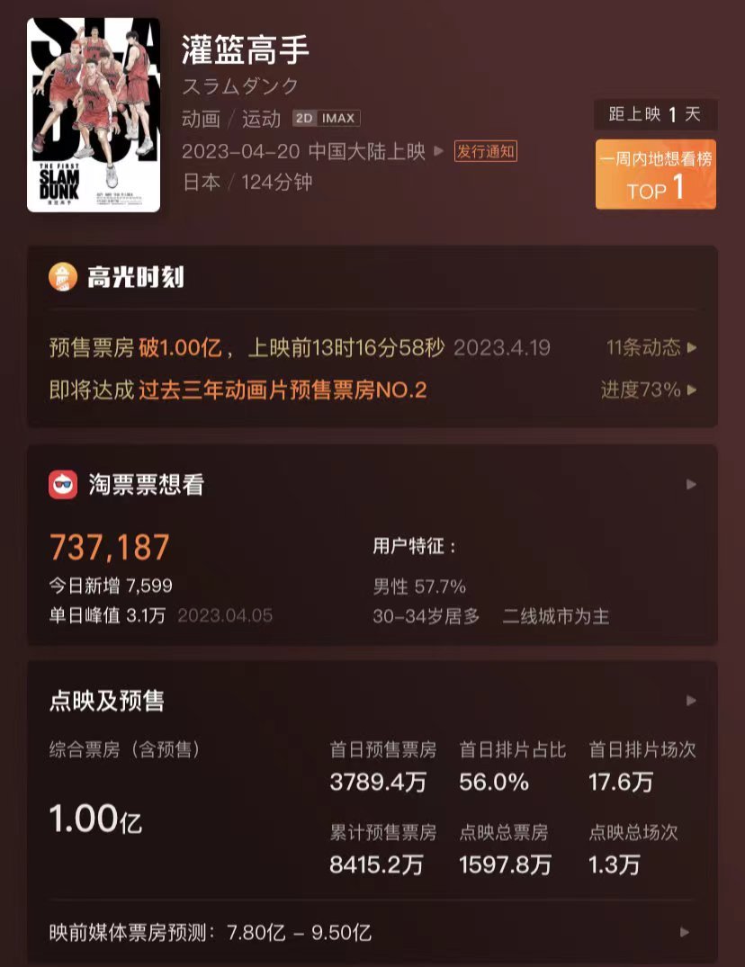 值得注意的是,承载了“80后90后”青春情怀的大IP电影《灌篮高手》将在4月20日上映,第三方媒体机构对其的票房预测在4.5亿元-6亿元左右。根据最新数据,电影《灌篮高手》上映前1天 ,点映及预售总票房破1亿。