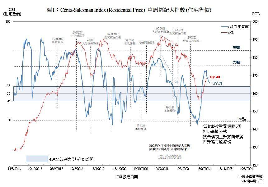 智通财经APP获悉,4月19日,中原地产研究部发文称,中原经纪人指数CSI(住宅售价)最新报57.71点,较上周的58.21点下跌0.50点。近期香港二手房产市场出现拉锯局面,成交转淡,而且4月份香港金管局连番承接市场的港元沽盘,香港银行体系总结余持续下跌,加息压力增加,以致前线经纪人的乐观情绪逐渐转弱。CSI连跌6周共8.55点,但仍高于55点好淡分界区间上限,预示楼价升势减慢。如果CSI能够守住55点水平,楼价将继续窄幅争持,仍未有转势向下的迹象。