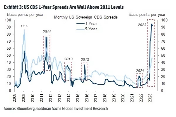 目前,美国的1年期信用违约掉期(CDS)利差远高于2011年水平——这也意味着市场对美国违约的担忧情绪不断升温,受政府支出影响的股票表现也明显落后。