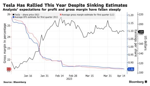 据估计,特斯拉第一季度汽车毛利率将从上一季度的25.9%降至23%。自去年12月底以来,利润预期已被下调了28%,至每股86美分。