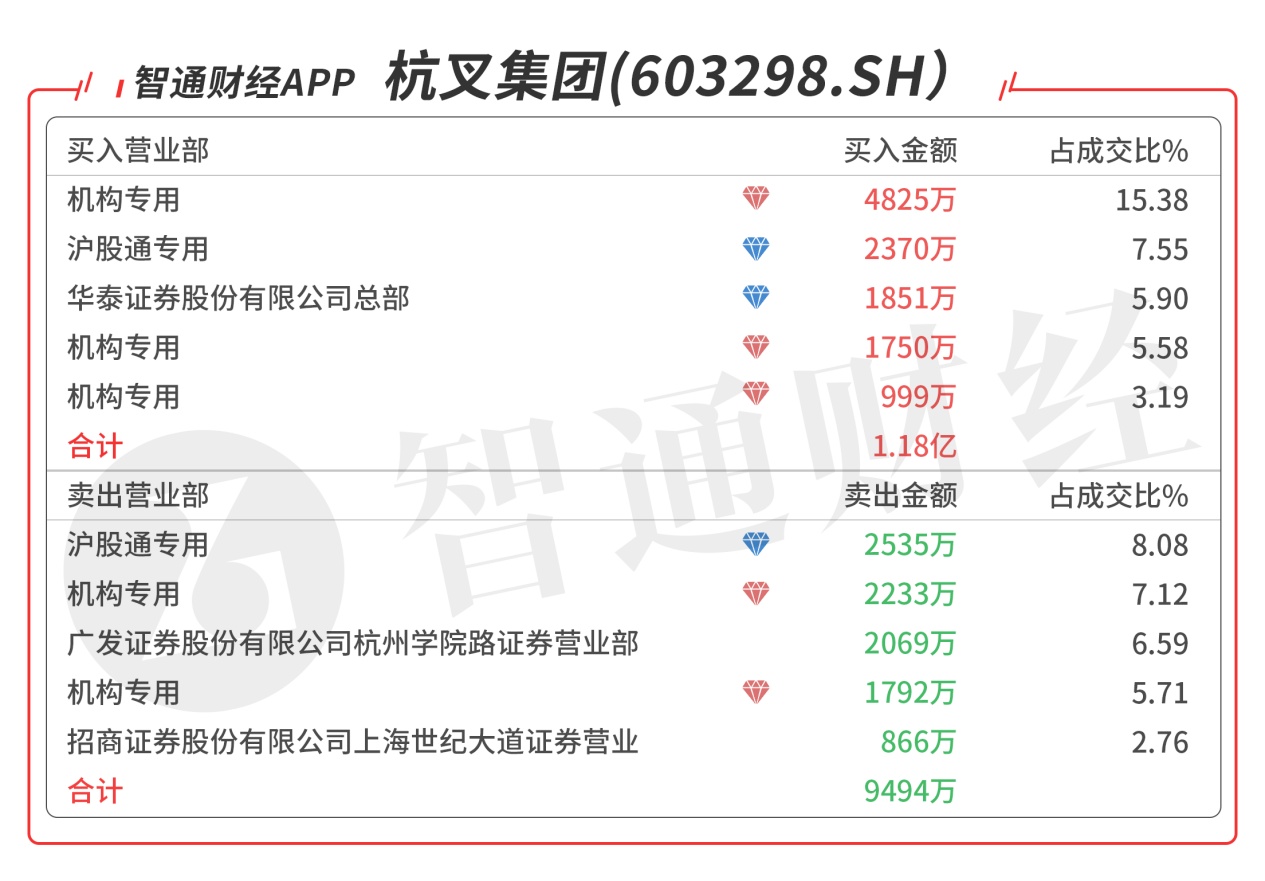 杭叉集团(603298.SH):受到众多机构青睐,今日共5个机构席位出现在龙虎榜单上,对倒合计净买入3550万元,沪股通对倒卖出165万元,买三是量化基金的席位买入1851万元,当日净买入2301万元,该股今日突破所有均线,持续上升需放量。