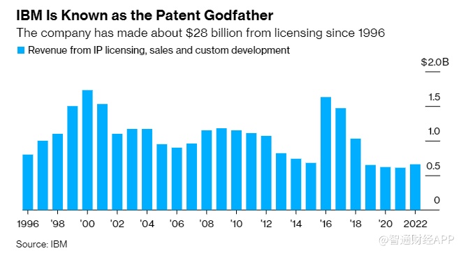 这起诉讼将IBM的一个关键收入来源——知识产权许可置于聚光灯下。自1996年以来,该公司从授权交易中赚取了280亿美元。长期以来,IBM一直是美国专利收入最多的公司,不过去年跌至第二位。