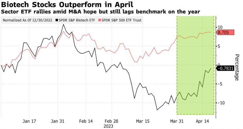根据彭博汇编的数据,2022年美国生物技术交易的平均溢价为96%,高于2021年的67%。去年美国所有行业的交易中,平均溢价为49%。对生物技术行业来说,并购需求的复苏是一剂强心针。过去一年,由于利率上升导致风险偏好减弱,生物技术行业一直受到拖累。SPDR标普生物科技ETF本月涨幅超过8%,超过了一只追踪标普500指数的类似基金约1%的涨幅。然而,继2022年下跌26%之后,SPDR标普生物科技ETF今年仍下跌约0.8%,比2021年2月的纪录水平低50%以上。