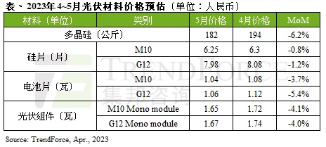 光伏组件方面,尽管上游硅料价格降至每公斤200人民币以内,但成本下降带来的利润空间多被截流在硅片和电池片环节,故光伏组件价格暂时尚未明显下滑,实际成交价仍维持在每瓦约1.75人民币。但从近期招标项目的光伏组件报价来看,部分厂商为了销售而低价抢单,故基本都已降至每瓦1.7人民币以下,TrendForce集邦咨询预计至第三季光伏组件价格才会全线回归正常区间,每瓦约1.6人民币。