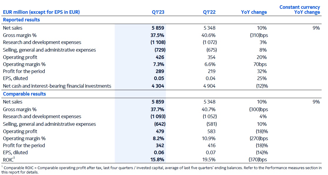 智通财经APP获悉,4月20日,诺基亚(NOK.US)公布了2023年第一季度财务业绩。财报显示,诺基亚Q1净销售额为58.59亿欧元,同比增长10%,好于分析师普遍预期的57.3亿欧元;其中,企业净销售额同比增长65%。经调整的营业利润为4.79亿欧元,同比下降18%,不及分析师普遍预期的5.44亿欧元;经调整的每股收益为0.06美元,不及分析师普遍预期的0.07美元。