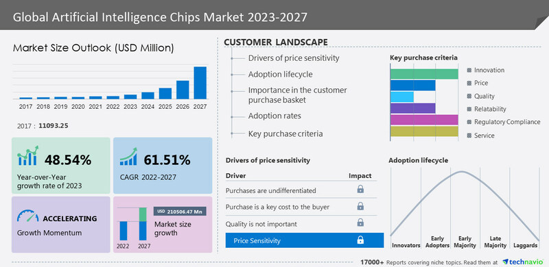 知名市场调研机构Technavio 在4月公布的一份最新研报显示,人工智能 (AI) 用途芯片的市场规模预计在2022-2027年期间以高达惊人的61.51%的复合年增长率爆炸式增长。该机构预计,在预测期内,ASIC这一细分市场将占市场增长的很大一部分。
