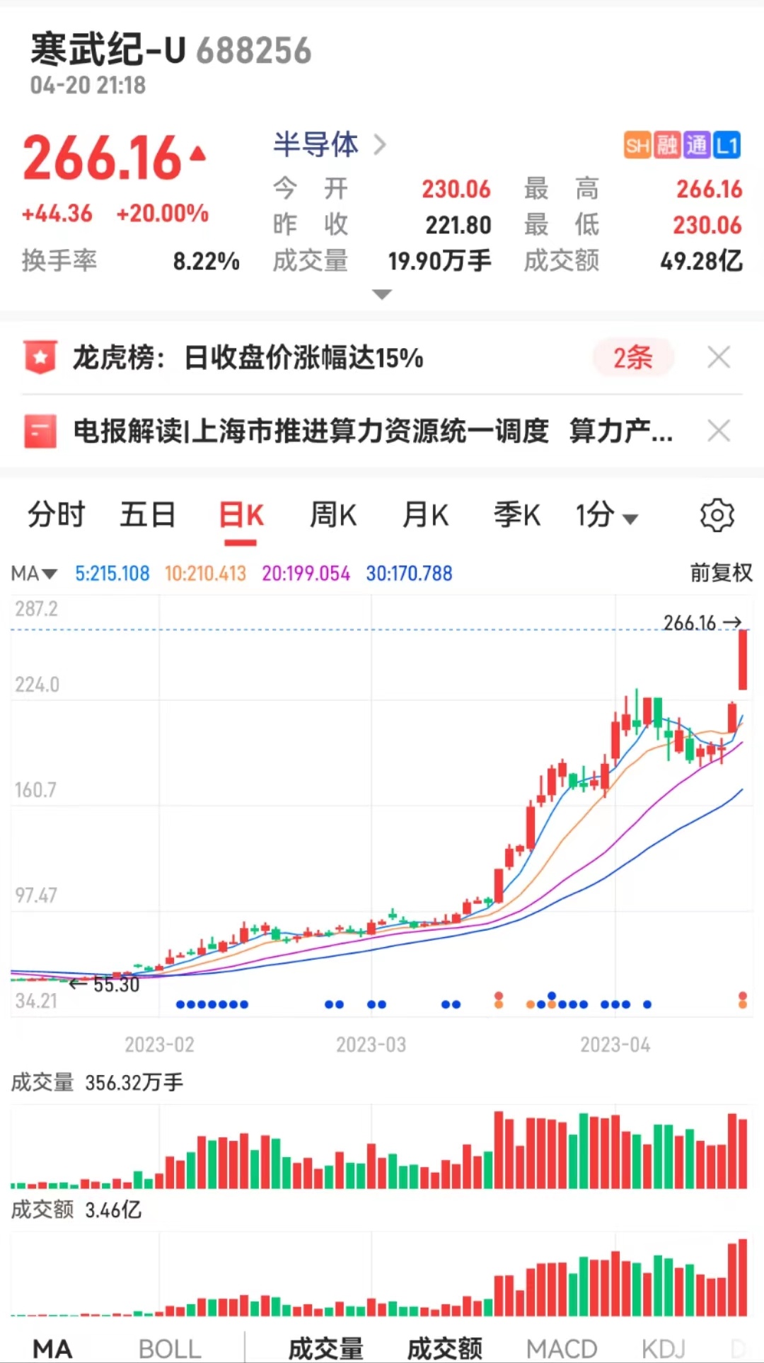 智通财经APP获悉,4月20日,寒武纪(688256.SH)收获“20CM”涨停,报266.16元/股,逼近历史高点,市值一举破千亿。寒武纪20日晚间发布异动公告称,公司致力于打造人工智能领域的核心处理器芯片,不直接从事人工智能最终应用产品(例如类ChatGPT应用)的开发和销售,公司相关产品正处于适配阶段,尚未产生收入;客户是否进行规模化采购受产品技术能力、交付能力、产品价格及客户采购意愿等因素影响,存在不确定性。