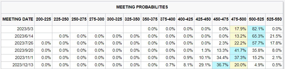 根据CME“美联储观察工具”,市场目前预计美联储将于5月份加息25个基点的概率为82.1%;随后,市场普遍认为美联储将于9月份开始降息,概率达41.7%。最终,在5月份最后加息25个基点的基础上,市场普遍预计美联储到12月份将降息50个基点至4.5%-4.75%,概率达36.7%。