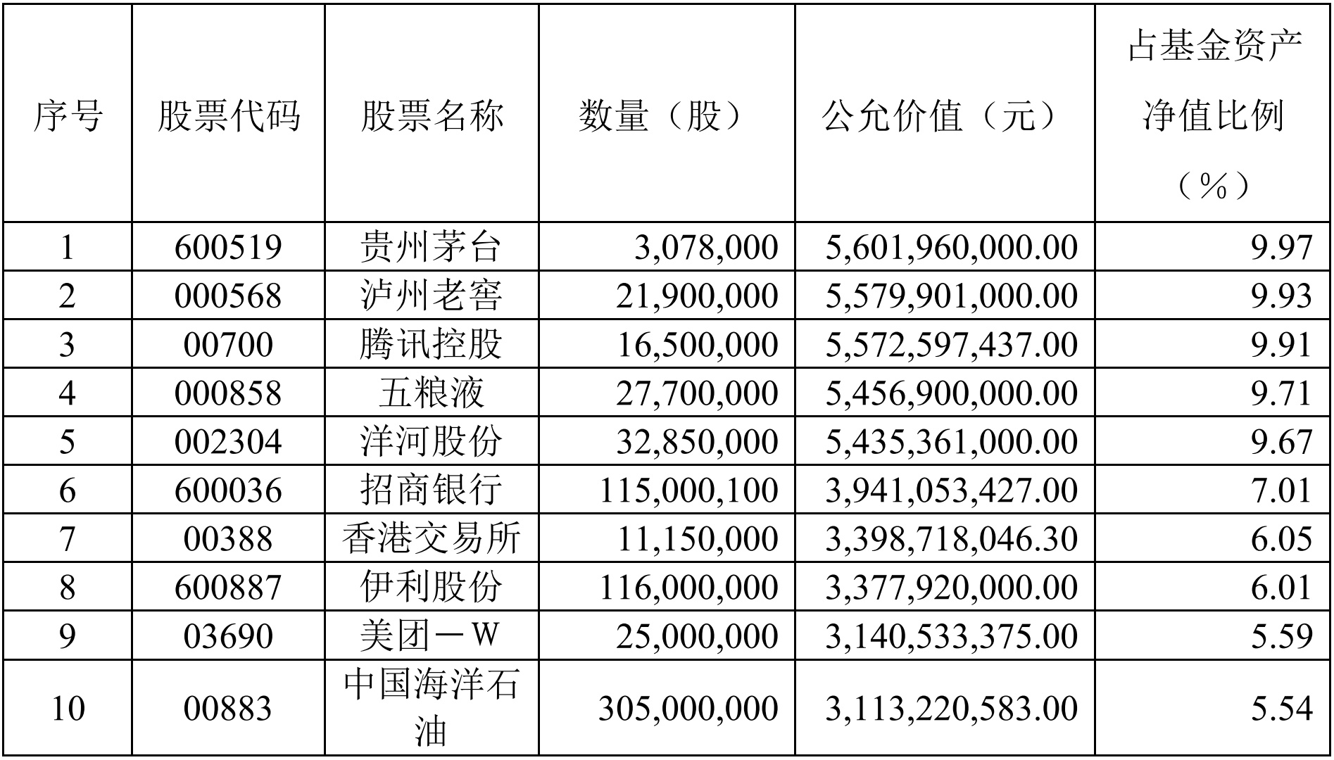重仓股方面,该基金前十大重仓股分别为贵州茅台(600519.SH)、泸州老窖(000568.SZ)、腾讯控股(00700)、五粮液(000858.SZ)、洋河股份(002304.SZ)、招商银行(600036.SH)、香港交易所(00388)、伊利股份(600887.SH)、美团-W(03690)、中国海洋石油(00883)。