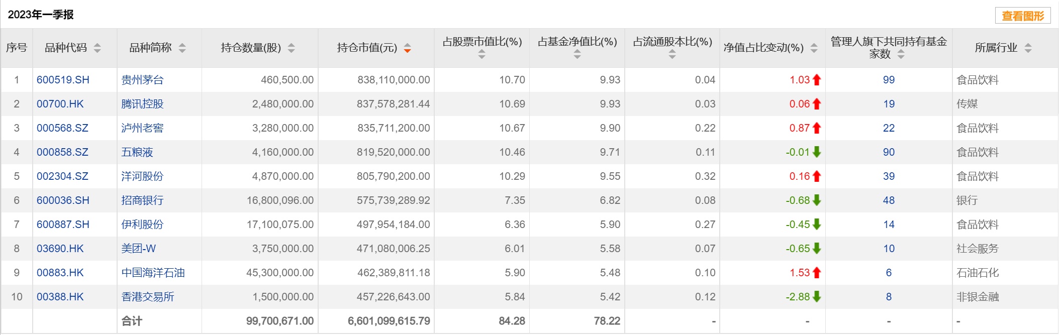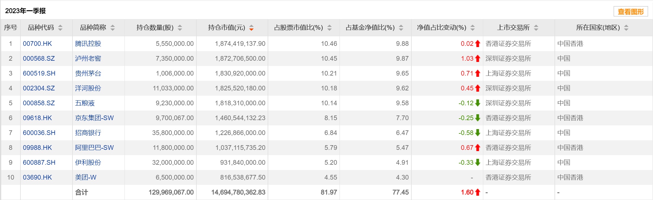 重仓股方面,该基金前十大重仓股分别为腾讯控股(00700)、泸州老窖(000568.SZ)、贵州茅台(600519.SH)、洋河股份(002304.SZ)、五粮液(000858.SZ)、京东集团-SW(09618)、招商银行(600036.SH)、阿里巴巴-SW(09988)、伊利股份(600887.SH)、美团-W(03690)。