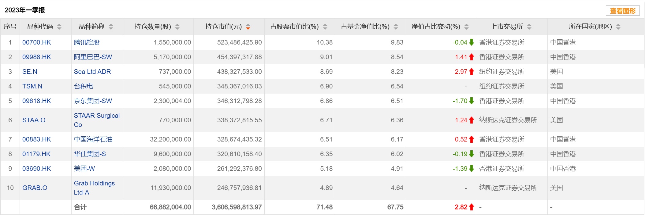 具体来看,该基金前十大重仓股分别为腾讯控股(00700)、阿里巴巴-SW(09988)、Sea Ltd ADR(SE.US)、台积电(TSM.US)、京东集团-SW(09618)、STAAR Surgical Co(STAA.US)、中国海洋石油(00883)、华住集团-S(01179)、美团-W(03690)、Grab Holdings Ltd-A(GRAB.US)。