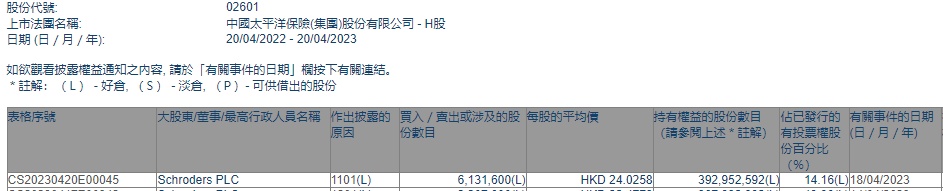 智通财经APP获悉,香港联交所最新资料显示,4月18日,Schroders PLC增持中国太保(02601)613.16万股,每股作价24.0258港元,总金额约为1.47亿港元。增持后最新持股数目约为3.93亿股,最新持股比例为14.16%。