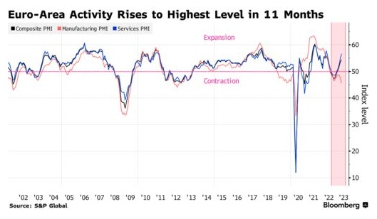 智通财经APP获悉,由于服务业活动的复苏,欧元区的经济反弹势头在4月份进一步增强,同时,该地区商业前景对最近银行业的压力仍然具有弹性。标普全球的商业调查显示,受需求增加和就业显著增长的推动,欧元区4月Markit综合PMI初值加速至11个月高点,达到54.4。