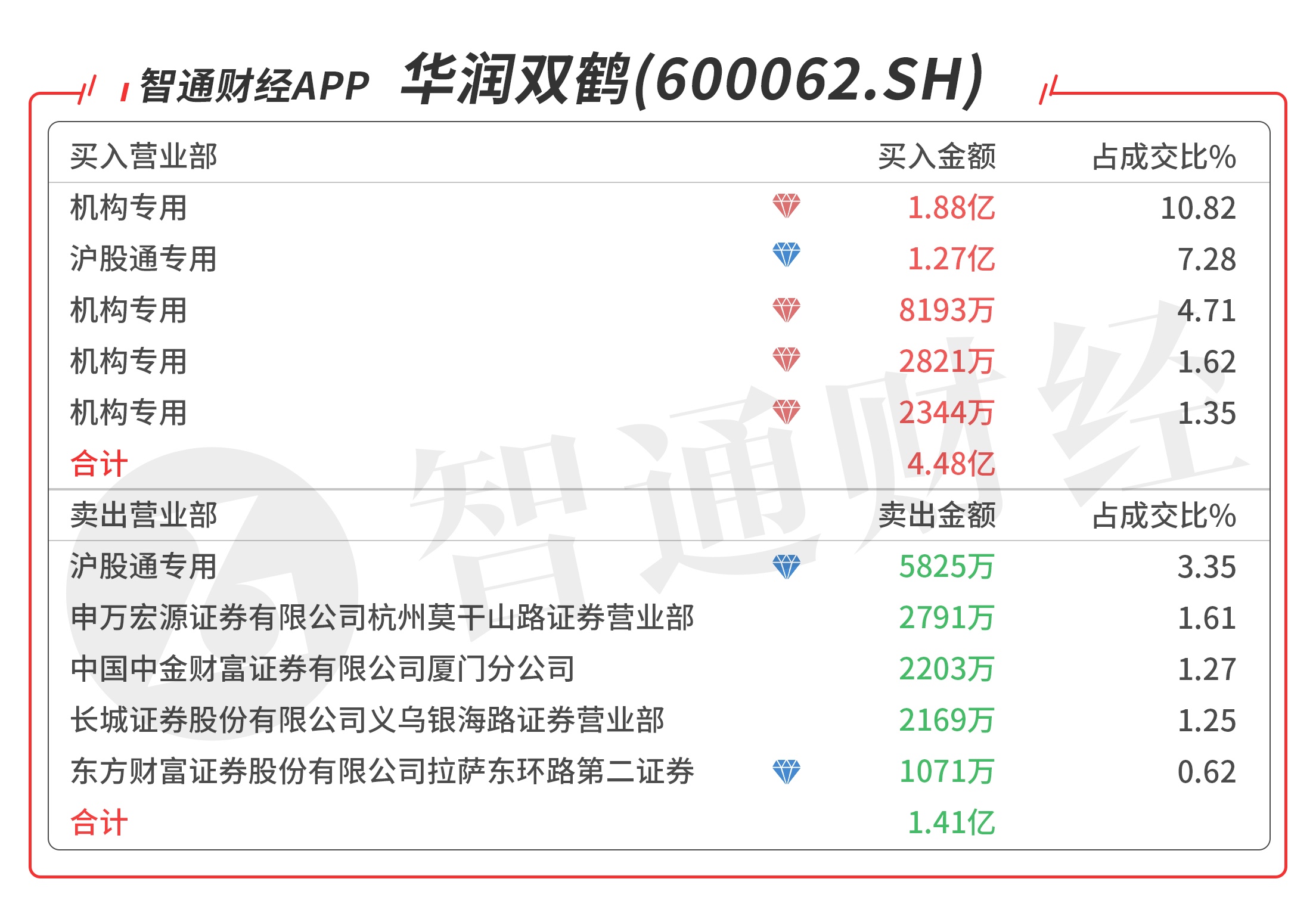华润双鹤(600062.SH):受到众多机构青睐,今日共4家机构席位出现在龙虎榜单上,合计净买入3.22亿元,沪股通对倒净买入6827万元,当日净买入3.08亿元,该股今日底部首板,预计有溢价。