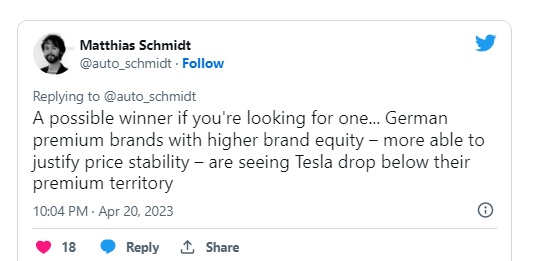 知名汽车行业分析师 Matthias Schmidt近日发文称:“一个可能的赢家,如果你正在寻找——那就是拥有更高质量品牌资产,且更有能力证明价格稳定机制具备充分合理性的德国高端品牌,他们正眼睁睁地看着特斯拉远离他们的高端市场。”
