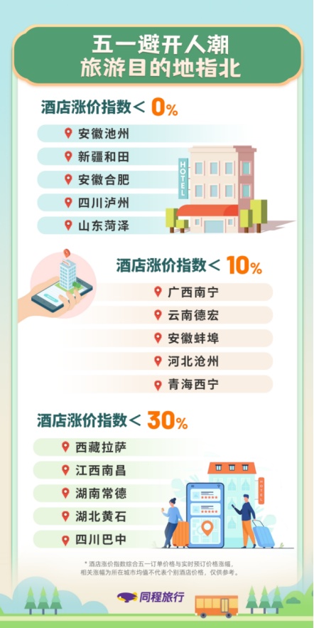如何避开人潮、出游性价比高是人们“五一”出行最关注的问题之一。同程研究院综合参考“五一”期间酒店订单价格与实时预订价格涨幅,给出酒店涨价指数较低的旅游目的地,供用户选择。数据显示,安徽池州、新疆和田、安徽合肥、四川泸州、山东菏泽等城市,是“五一”假期性价比较高的小众目的地。南宁、德宏、蚌埠、沧州、西宁、拉萨、南昌、常德、黄石、巴中等城市,五一假期酒店涨价指数基本在30%以下,同样值得关注。
