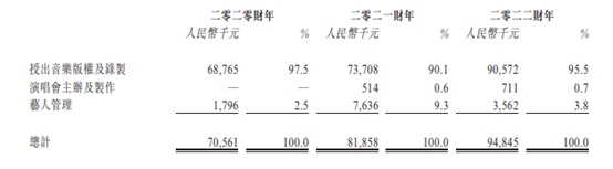 从业务模式来看,公司主要从事三大业务板块,音乐版权许可及音乐录制为主要业务板块;演唱会主办及制作;及艺人管理。三项业务分别占公司2022年总收入的95.5%、0.7%及3.8%。从中不难看出,尽管风华秋实在招股书中表示“相互补充能够创造协同效益”,但仍旧难掩其高度依赖售出音乐版权及录制是该公司主要业务的适时,与该公司大部分收益来自于音乐作品授权的商业模式。