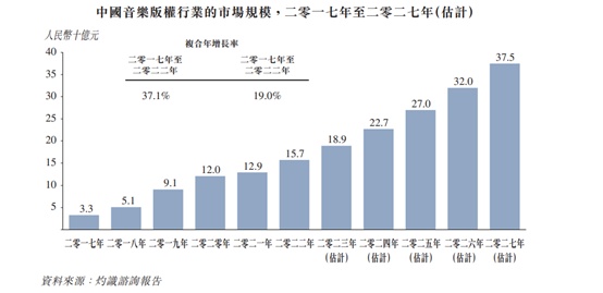 招股书显示,中国音乐版权行业的市场规模由2017年的约33亿元增加至2022年的约157亿元,复合年增长率约为37.1%。受到多元音乐传播渠道及音乐版权需求不断增加的驱动,市场规模预期将维持高增长率并于2027年达约375亿元,自2022年起的复合年增长率约为19.0%。