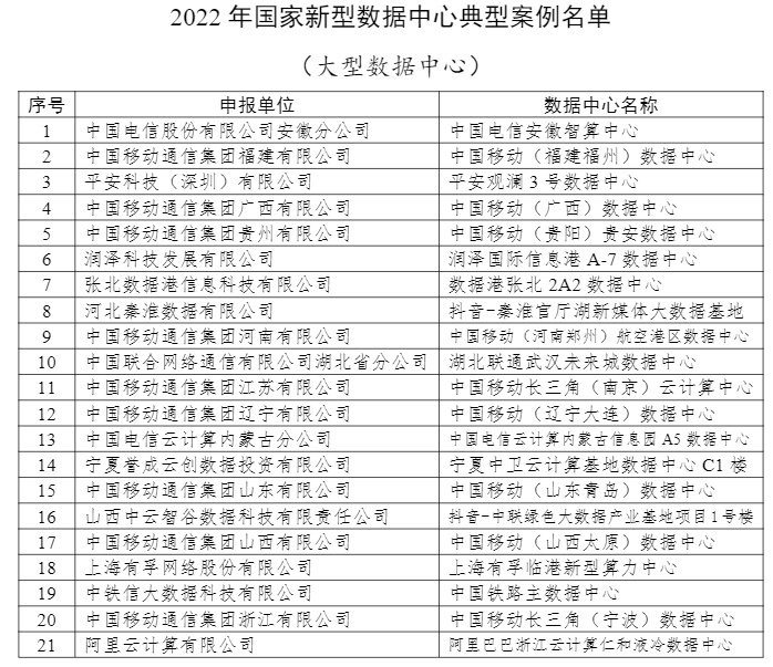 智通财经APP获悉,4月23日,工信部办公厅公布2022年国家新型数据中心典型案例名单。中国电信安徽智算中心,中国移动数据中心,阿里巴巴浙江云计算仁和液冷数据中心等在列。