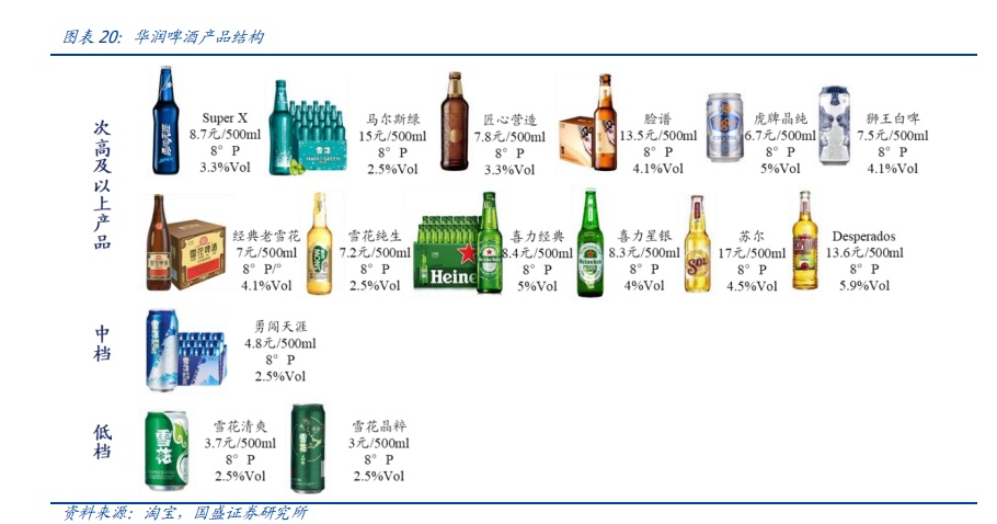从战略规划来看,华润啤酒一方面通过自主研制高端新品,弥补价格带空缺;一方面通过收购国际品牌喜力,获得旗下产品。2019年后,华润啤酒确定了“4+4”产品组合的策略,通过四大本土品牌(SuperX、马尔斯绿、匠心营造、脸谱)和四大国际品牌(喜力、苏尔等)的共同发力,打造华润啤酒的高端化发展之路。目前已形成了超高档(雪花脸谱啤酒、苏尔啤酒),高档(雪花匠心营造啤酒、喜力啤酒、雪花马尔斯绿啤酒),普高(雪花纯生啤酒、虎牌啤酒)和次高(勇闯天涯SuperX)的产品组合。