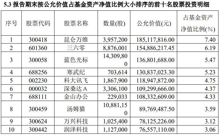 具体来看,以吕越超在管的海富通股票混合(519005)为例,该基金一季度砍仓新能源,几乎重仓了今年AI板块涌现出来的所有牛股,比如昆仑万维(300418.SZ)、三六零(601360.SH)、蓝色光标(300058.SZ)、寒武纪(688256,SH)、科大讯飞(002230.SZ)、金山办公(688111.SH)、万兴科技(300624.SZ)、汤姆猫(300459.SZ)等。