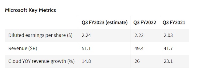 智通财经APP获悉,在美股位列市值第二的微软(MSFT.US)将于美东时间4月25日美股盘后公布2023财年第三季度业绩,Seeking Alpha平台统计的分析师预期数据显示,分析师们普遍预计微软Q3营收约为511亿美元(同比增长约4%),GAAP每股收益约为2.24美元,相比之下上一季度分别为527.5亿美元以及2.32美元。