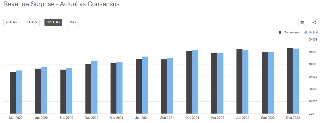 在超预期方面,微软的业绩很少令投资者失望,在过去12个季度中,有10次营收超分析师普遍预期,有11次每股收益(EPS)超出分析师普遍预期。因此,不少投资者预计微软Q3业绩虽然略显疲软,但超出预期的概率非常高。根据Visible Alpha编制的预期数据,分析师预计微软Q3实现净利润167亿美元,合每股2.24美元,与上年同期基本持平。