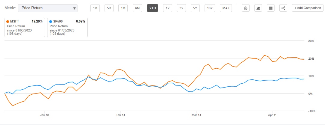 微软股价在最近触及14年高点,年内涨幅超过19%。相比之下,该股同期涨幅略高于标准普尔500信息技术(IT板块)指数(S&P500 Information Technology index) ,远高于美股大盘——标普500指数。