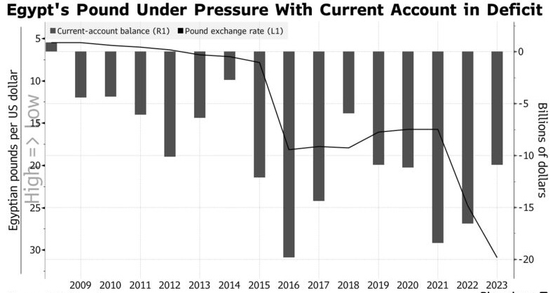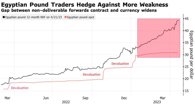 尽管埃及镑在现货市场上的交易变化不大,但投资者对埃及镑自2022年3月以来的第四次贬值感到担忧。在过去的一年里,该货币贬值了约50%,但仍然远高于黑市报价的利率,这凸显了进一步贬值的风险。