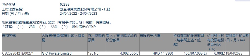 智通财经APP获悉,香港联交所最新资料显示,4月18日,GIC Private Limited减持紫金矿业(02899)466.2万股,每股作价14.3360港元,总金额约为6683.44万港元。减持后最新持股数目约为4.01亿股,最新持股比例为6.99%。