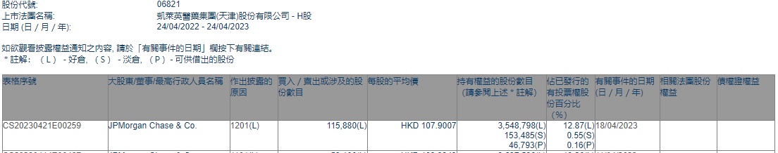智通财经APP获悉,香港联交所最新资料显示,4月18日,小摩减持凯莱英(06821)11.588万股,每股作价107.9007港元,总金额约1250.35万港元。减持后最新持股数目约为354.88万股,最新持股比例为12.87%。