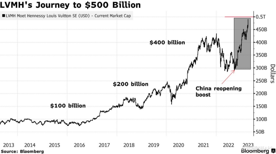智通财经APP获悉,奢侈品巨头LVMH的市值超过5000亿美元,成为第一家达到这一里程碑的欧洲公司,这得益于奢侈品在中国的热销以及欧元走强。不到两周前,在第一季度销售额激增的推动下,LVMH 跻身全球十大公司之列。竞争对手爱马仕随后也发布了强劲的业绩,这进一步表明,中国从疫情封锁中重新开放正在推动整个行业的增长。