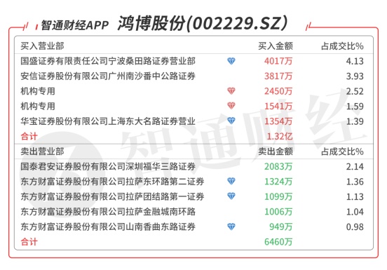 鸿博股份(002229.SZ):多主力现身龙虎榜,2家机构席位买入3698万元,买一是知名游资的席位买入3911万元,买五是知名游资的席位买入1321万元,当日净买入8003万元,该股调整充分今日涨停,强势特征明显。