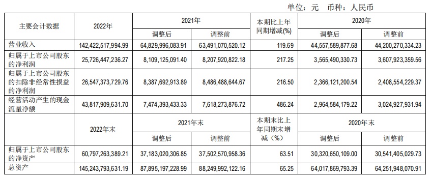 2022年,公司实现营业总收入1424.23亿元,同比增长119.69%,再创历史新高,且市值也一度突破3000亿元大关。归属母公司股东净利润257.26亿元,同比增长217.25%。2023年一季度实现净利润86.01亿元,同比增长65.59%。